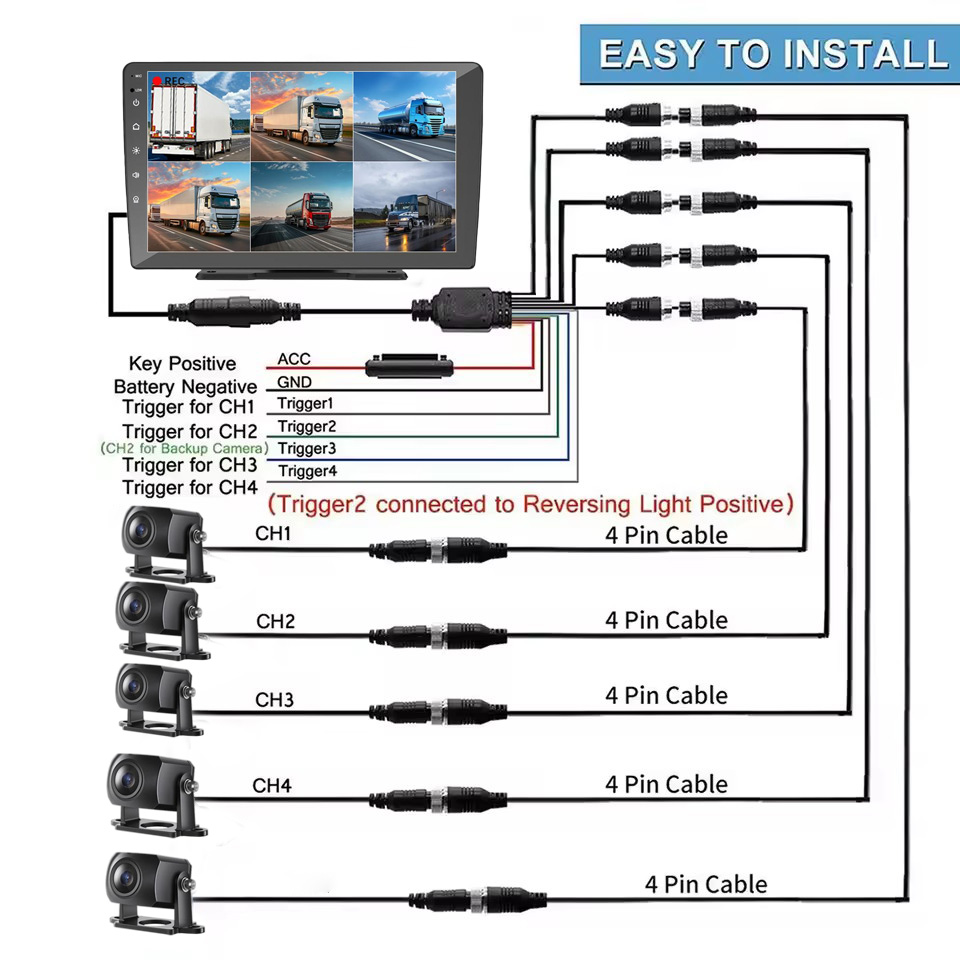 【Truck, RV Camera System With 4 HD1080p Cameras】Back up camera systems for truck, RV, etc., specially designed for large vehicles, front and rear view cameras & 2 side view cameras bring 360° full view coverage, no blind spot, bring better safety for driving.